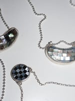 Mother of pearl, abalone, and brown lip shells set in sterling silver. Made to order. Comes on a 16" sterling silver ball chain, unless another length specified in check out notes.