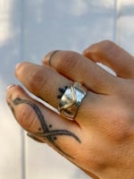 A solid, 10.4mm sterling silver band with a brass snake accent. Size 8.25, but given the band's width, suggested for a size 7.25 - 7.5 finger.
