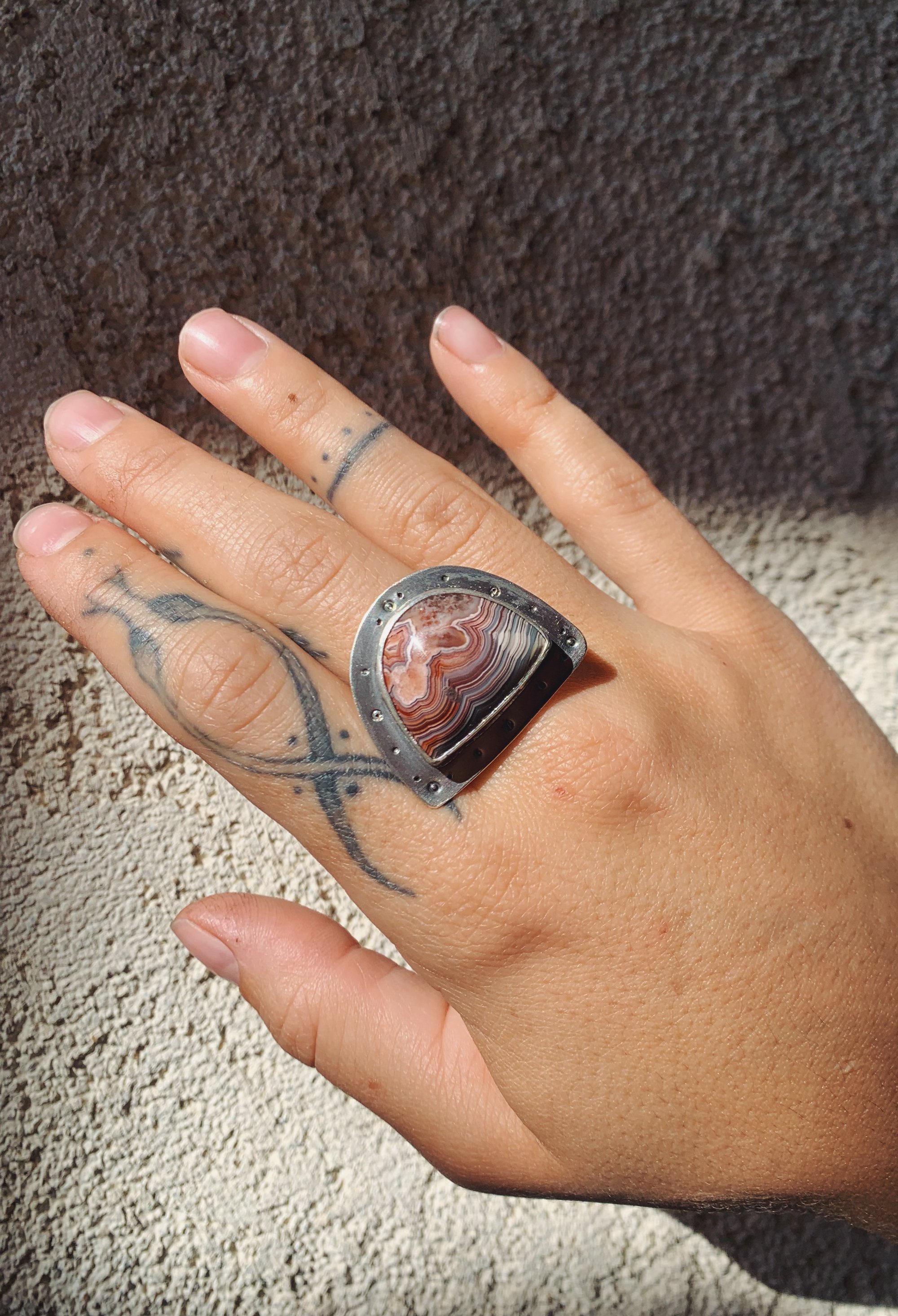 A beautiful piece of Laguna Lace Agate with layers of colors and intricate patterns, set on a large piece of sterling silver on a size 8 band.