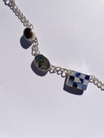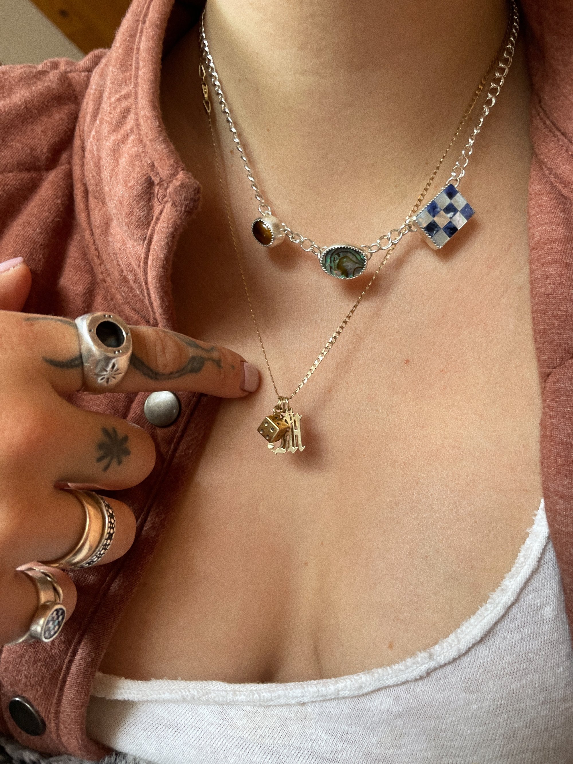 Left to right, tigers eye, abalone & a vintage mother of pearl / sodalite inlay mosaic stone. All charms are attached to a 4.2mm sterling silver double-cable chain. Chain currently at 16" but can easily be worn at any length under 16" (also can change chain length upon request, please specify in checkout notes).