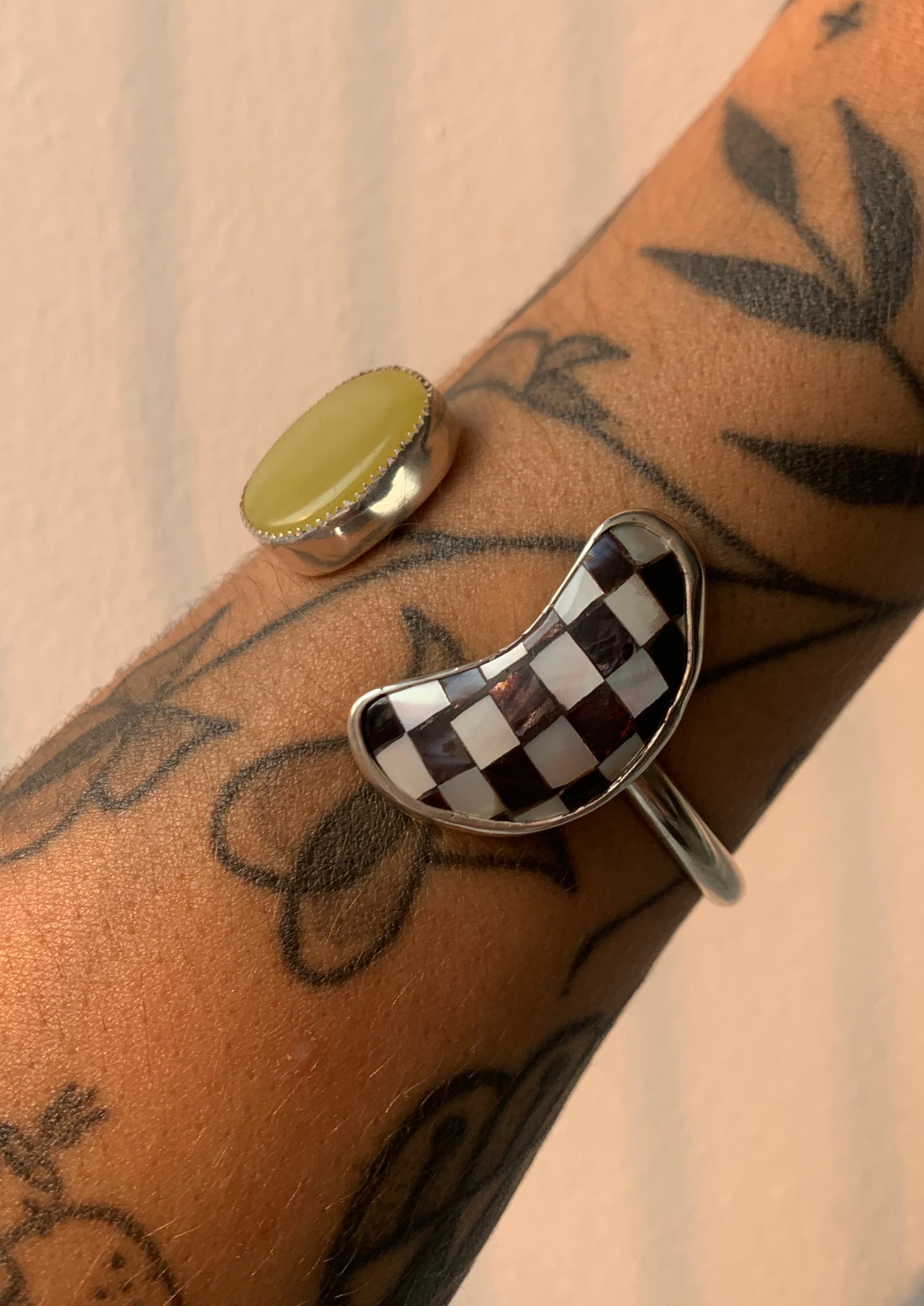 Lemon jade + checkered mother of pearl and shell mosaic stone set in sterling silver.