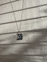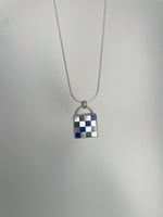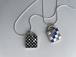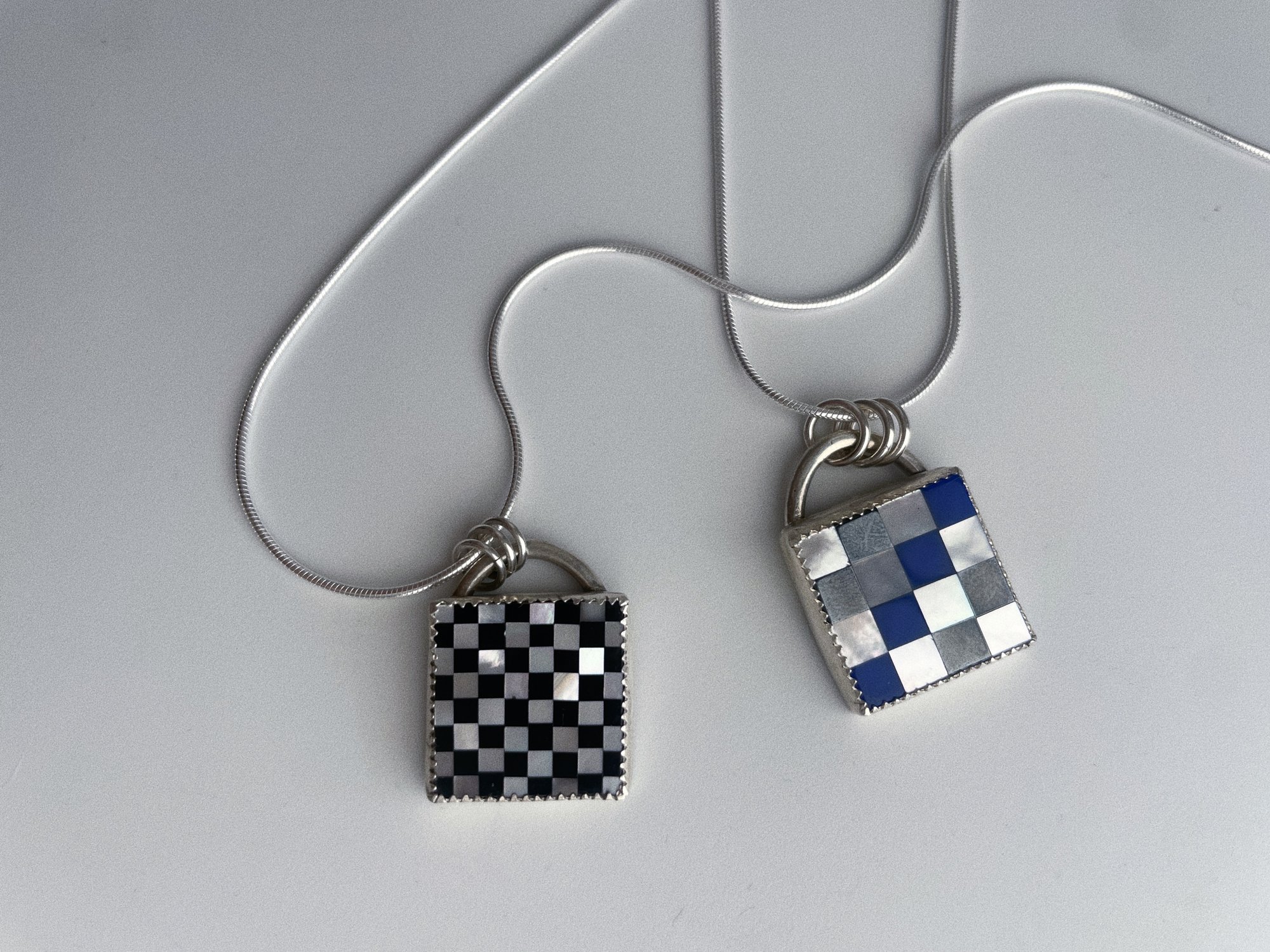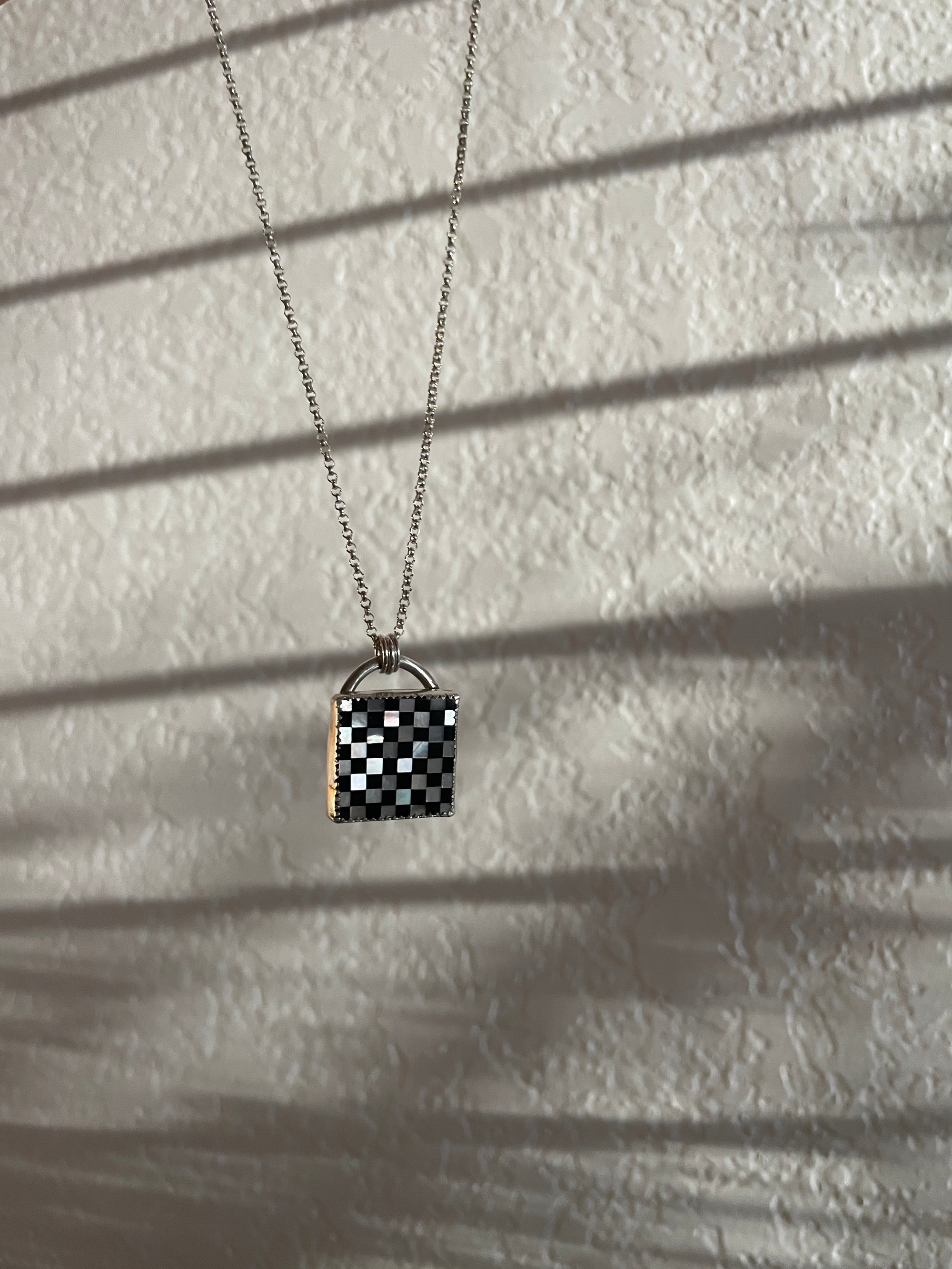 Beautiful checkered mother of pearl inlay stones set in sterling silver pendants on a solid sterling silver 20" snake chain (make a note at checkout if you'd prefer a 18" snake chain.)