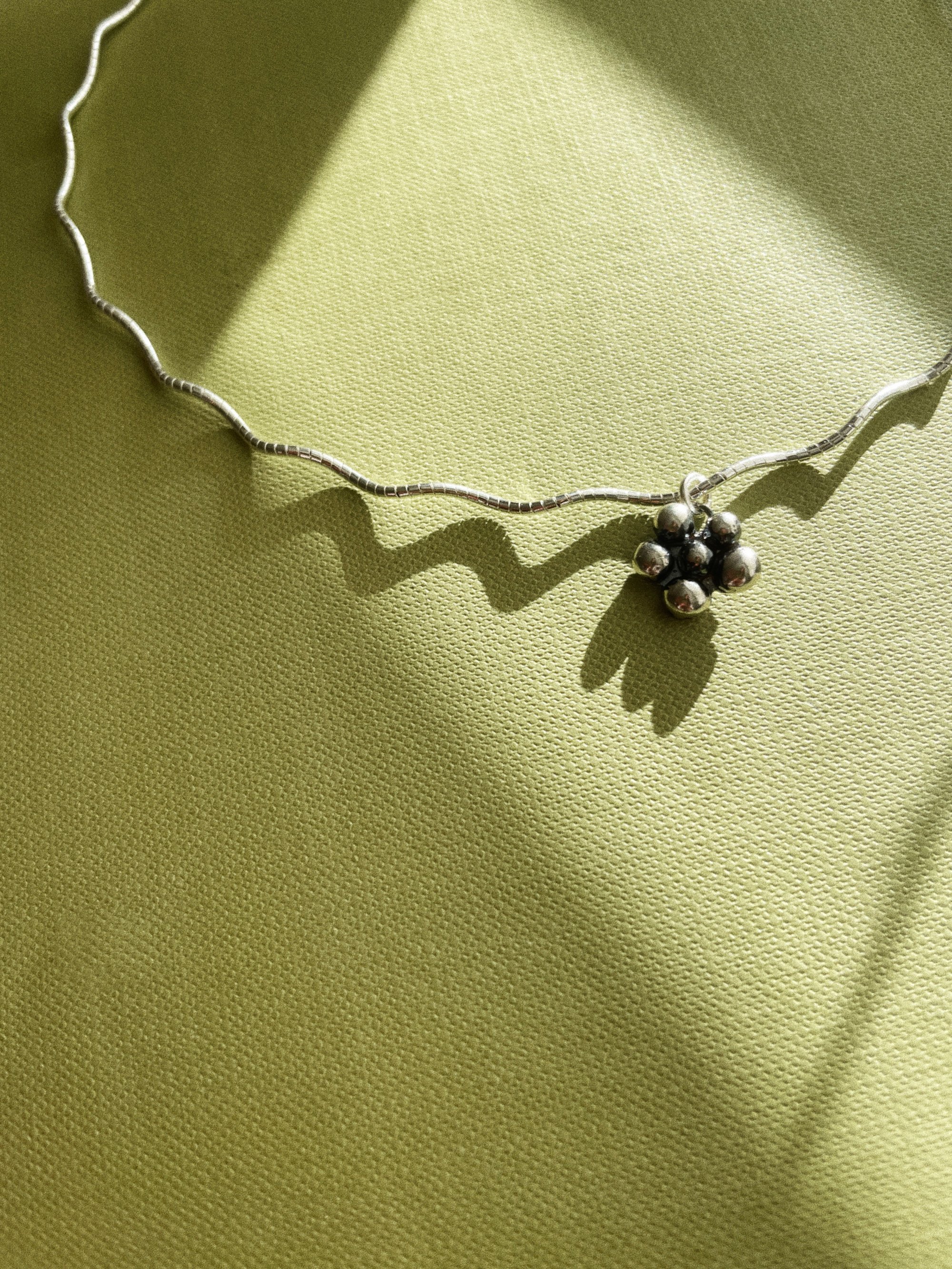 your choice of yellow bronze or sterling silver flower charm on a squiggly sterling silver 16" omega chain*.