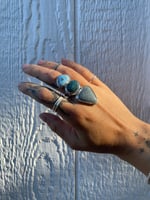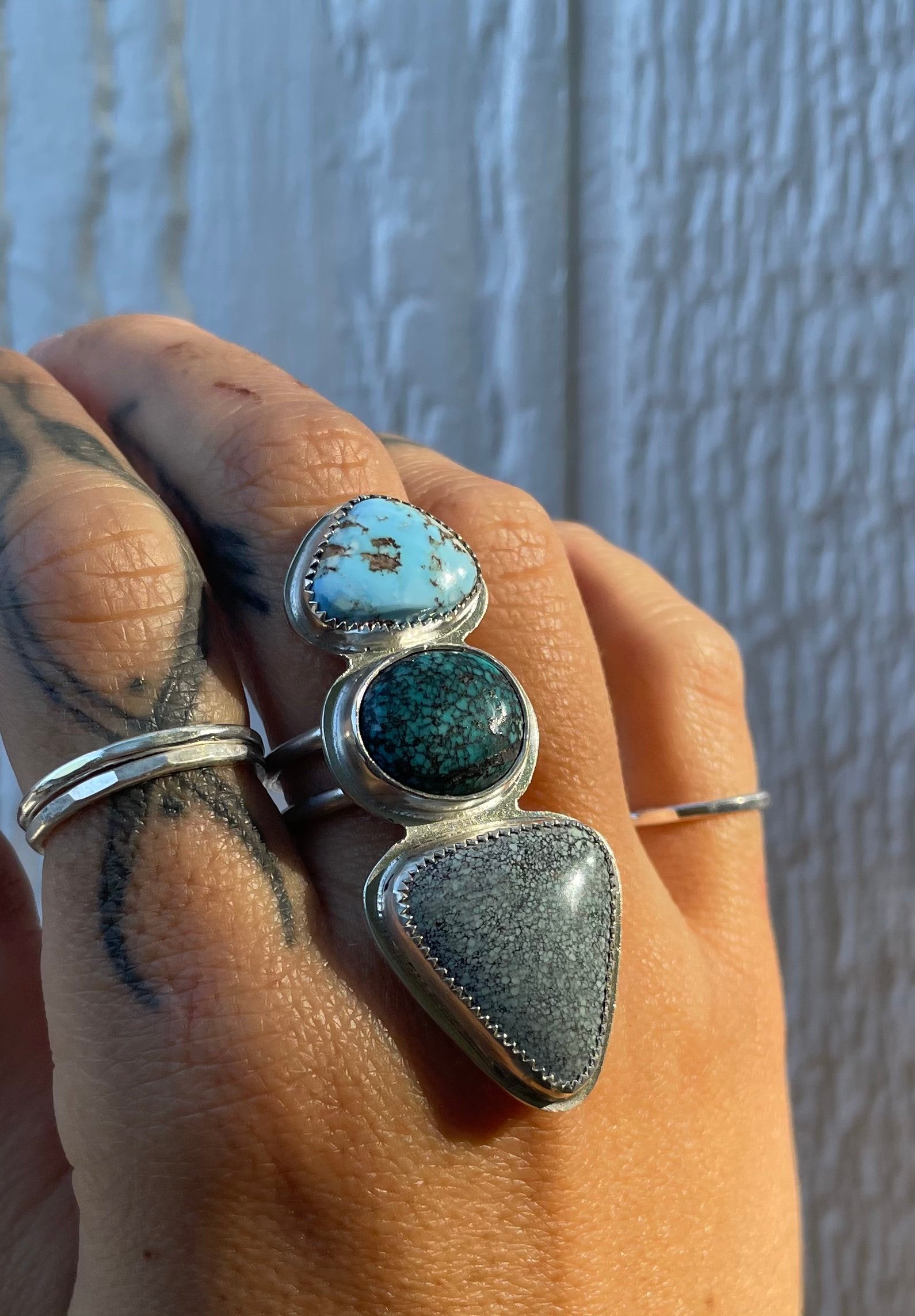 One of a kind sterling silver double band ring with three vibrant stones (top to bottom): Kazakhstan Turquoise, Lone Eagle Variscite, Bao Canyon Turquoise.